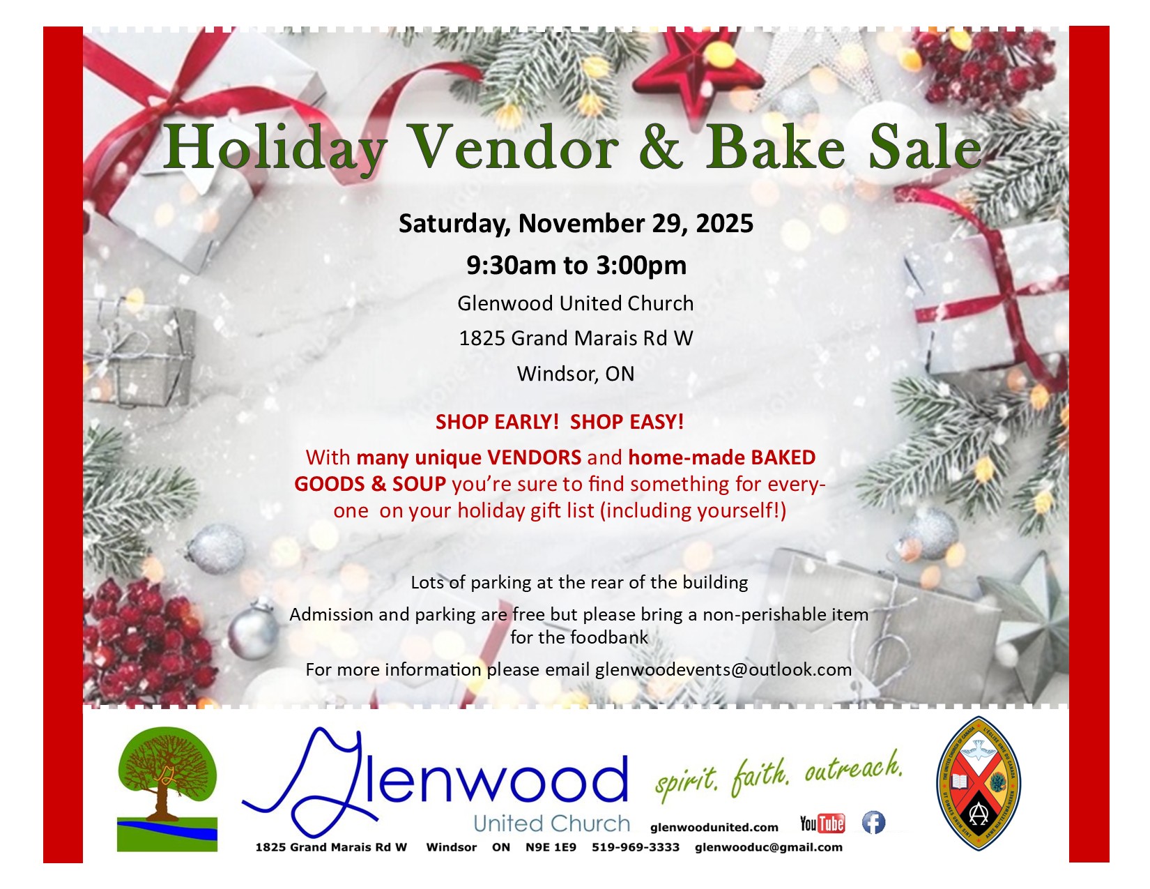 SHOP EARLY! SHOP EASY! With many unique VENDORS and home-made BAKED GOODS AND SOUP you’re sure to find something for everyone on your gift list (including yourself). Admission and Parking (lots at rear of building) are free but please bring a non-perishable item for the foodbank. For more info please email glenwoodevents@outlook.com
