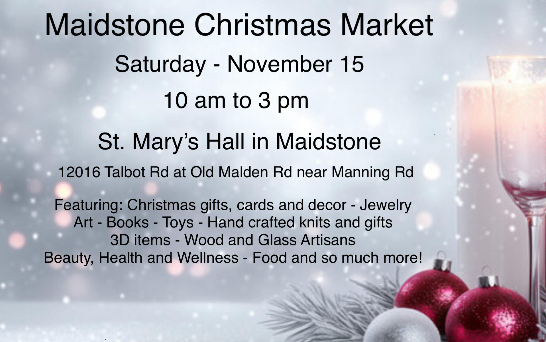 Maidstone’s 3rd Annual Christmas Market – Featuring 47 local Quality Vendors for all your holiday shopping and entertaining needs as well as health and wellness products. Shop and Support Canada