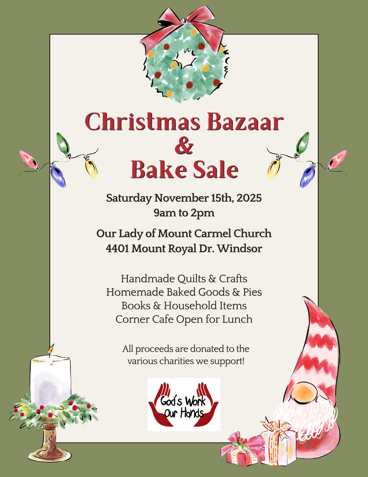 Come join us at Our Lady of Mount Carmel Church for our Annual Christmas Bazaar and Bake Sale on Saturday, November 15, 2025, 9:00 am to 2:00 pm at 4401 Mount Royal Drive in Windsor. We will have homemade baked goods and pies, handmade quilts and crafts, Christmas decor, books and household items, as well as delicious food available at our Corner Cafe. All proceeds are donated to the various charities we support. Looking forward to seeing you there!