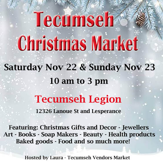 Tecumseh’s 4th Annual Christmas Market – 2 day event – Shop Local and support 40 quality vendors for all your holiday shopping and entertaining needs. Stop by and say hello – Join the fun!