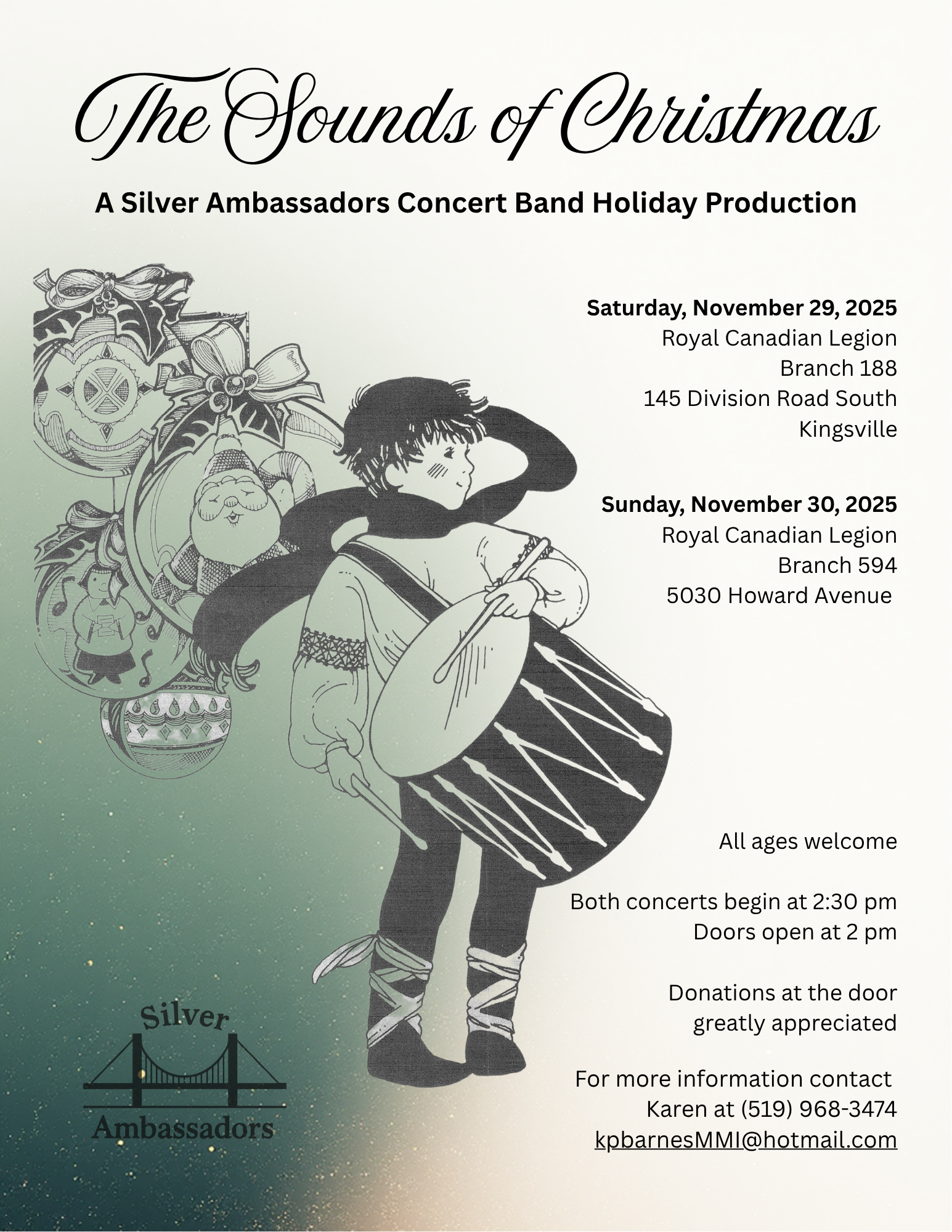 2nd event is on Sunday, November 30 at Royal Canadian Legion, Branch 594, 5030 Howard Avenue, Windsor at 2:30 pm. please note: the locations are different for each concert